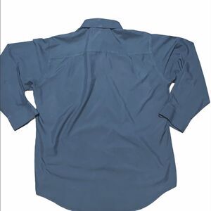 Olive green button down shirt. Left chest pocket. Long sleeve. Collared. High-low. 100% polyester. Size: 17 34/35. Preowned in good condition.