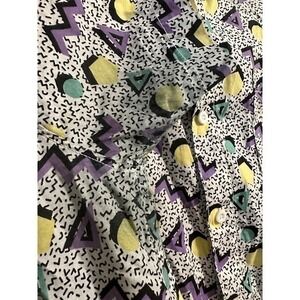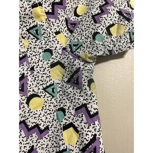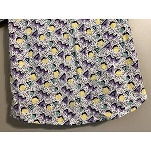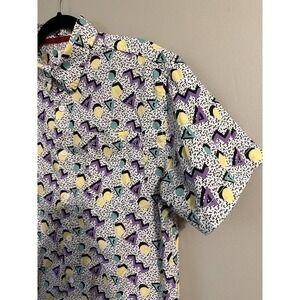 This 1999 Black Jack Brand Screech Saved By The Bell shirt is a vintage gem that is perfect for any occasion. The colorful geometric pattern and wing collared neckline make it a great option for travel, weddings, parties, casual wear, work, or business meetings. It features short sleeves, a button-up closure, and pockets, making it lightweight and suitable for all seasons. The shirt is machine washable, and its size L fits a chest size of 42 inches for a regular fit. The shirt is unisex, suitable for both men and women. The shirt's theme is nostalgic, reminiscent of the Screech Saved By The Bell era. The shirt is made from cotton and was manufactured in Bangladesh.