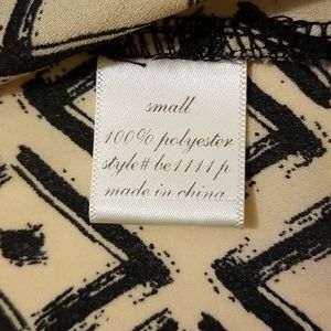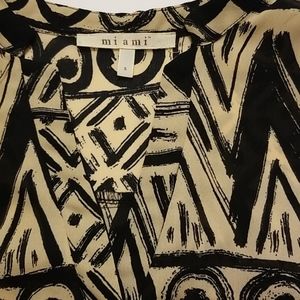 Blouse style tank with geometric patterns. Cream and black. Front pocket and 2 functional buttons below v-neck.