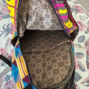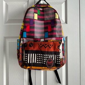Stylish backpack with bold geometric design.