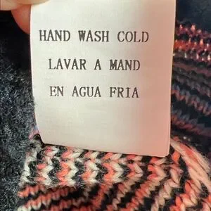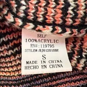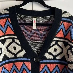 Chic geometric cardigan with bold patterns. Features black, pink, and blue hues. Perfect for layering.