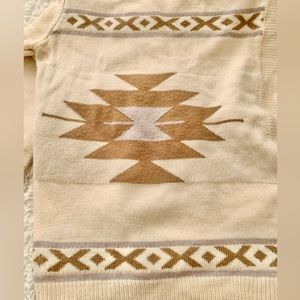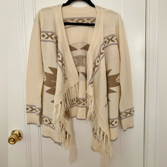 Geometric printed cardigan with waterfall and fringe detail. Super warm and soft