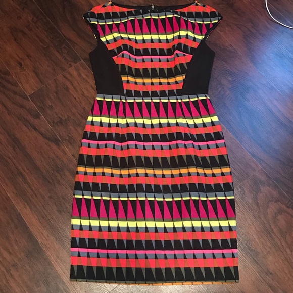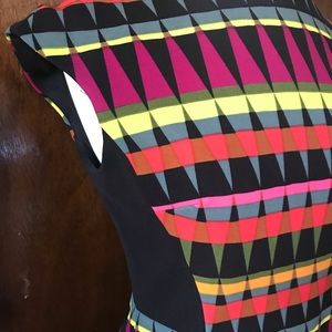Colorful fun patterned dress. Very stretchy and form flattering material. Gold exposed zipper for an edgy look. Straight cut skirt on the body of the dress but the waist cuts in nicely to give an A-frame look.