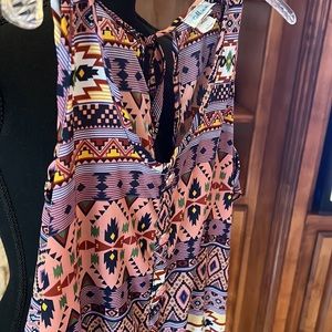 Geometric patterned romper made up of numerous bright colors including pink/salmon, navy blue, green, brown, and yellow