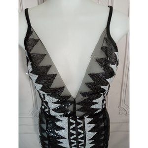 New without tags geometric party club dress. Deep plunge. Adjustable straps. Double slits in front. Sequins. Hidden back zipper. Size on tag inside says medium.