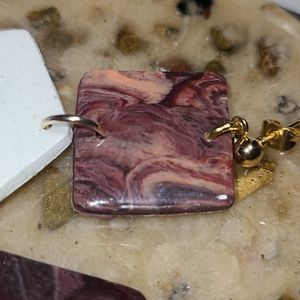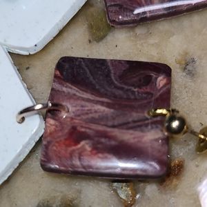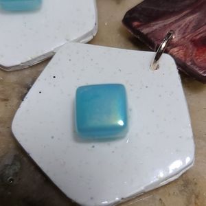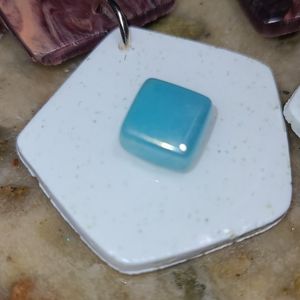 Top piece is an agate style square swirling with deep burgundy and cream colors. Next segment is white clay mixed with sage green sand. In the center lies a small iridescent sky blue mosaic piece. Both pieces are covered in a glossy resin layer.