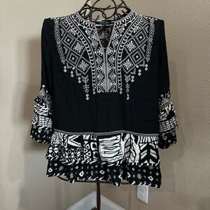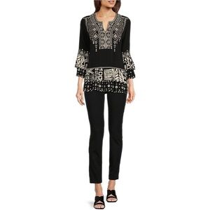 Geometric Embroidered Split Neck 3/4 Flounce Sleeve Merrow Edge Woven Tunic, EUC
