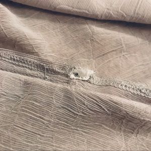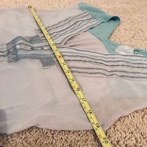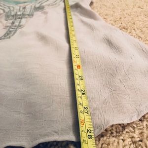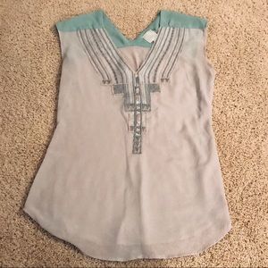 Gray geometric top with mint cap sleeves. Grey, mint, and purple embroidery with frayed edges.