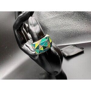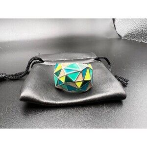 Geometric pattern ring with a cool mix of blue, yellow, and green enamel.