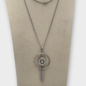 Geometric Floral Pendant Silver Tone Necklace – Modern Boho Layered Style, Long Chain, Minimalist Chic Jewelry