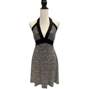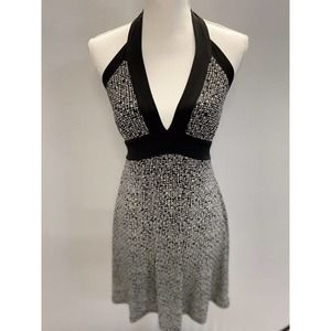Geometric black and white dress. Deep v-neck for ample cleavage. Halter with black at under bust to accent shape and flare bottom. Tie back. Excellent condition. Great club dress.