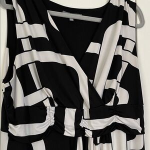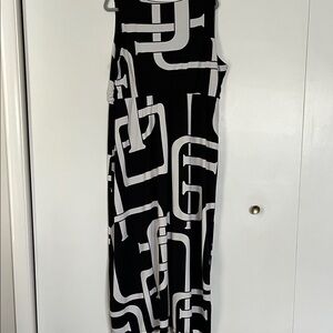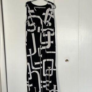 Chic maxi dress with bold black and white pattern. Sleeveless design with a flattering fit. Ideal for stylish outings. Easy wash and wear poly spandex blend. Fits more like a 2X.