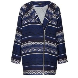 Aztec-inspired geometric terrain zigzags across the boxy woven landscape of this collarless mod-style jacket.
