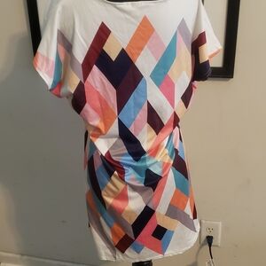 This vibrant geometric dress features a stunning array of colors, perfect for making a statement. The comfortable fit and eye-catching design make it a must-have for any wardrobe. There is no size tag in the dress but I say it fits more like a medium. I wear a lg/14 and it is very form fitting so I'd say it's more like a med. It's very cute!