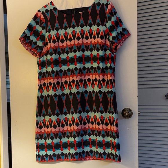 Eye-catching mini dress with bold geometric patterns. Features a mix of red, blue, and pink hues. Perfect dress for any spring or summer special event! It’s fun to wear and a flowing and flattering cut!