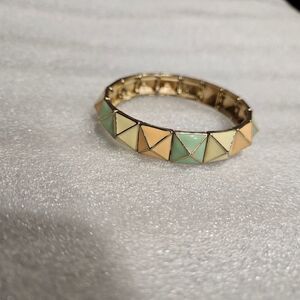 Elegant geometric bracelet featuring pastel tones of green, cream, and tan. Perfect for adding a subtle touch of color to any outfit.