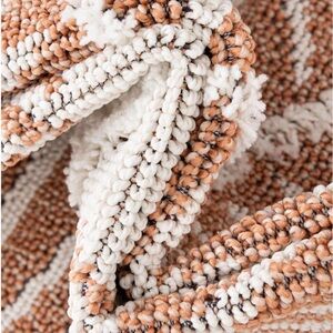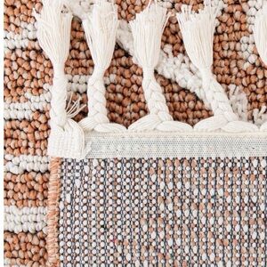 Stylish area rug with a geometric pattern. Features a blend of white and tan colors.