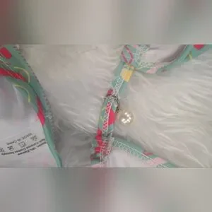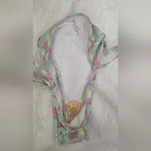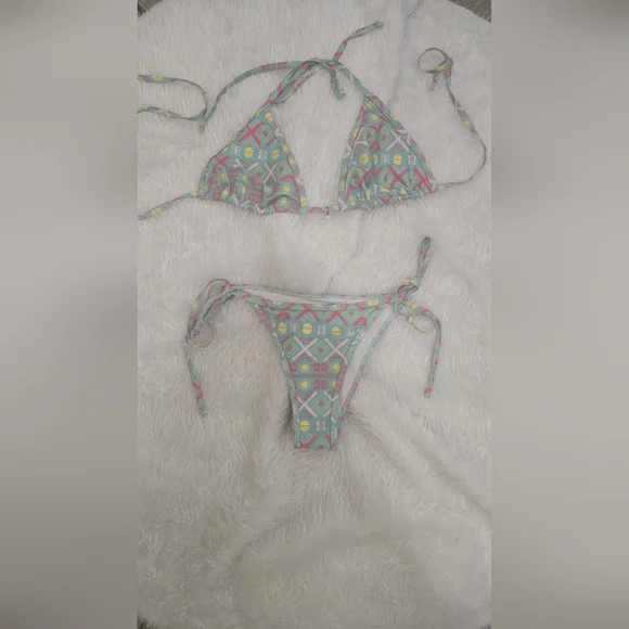 Stylish bikini with geometric patterns. Features adjustable ties. Perfect for beach days.