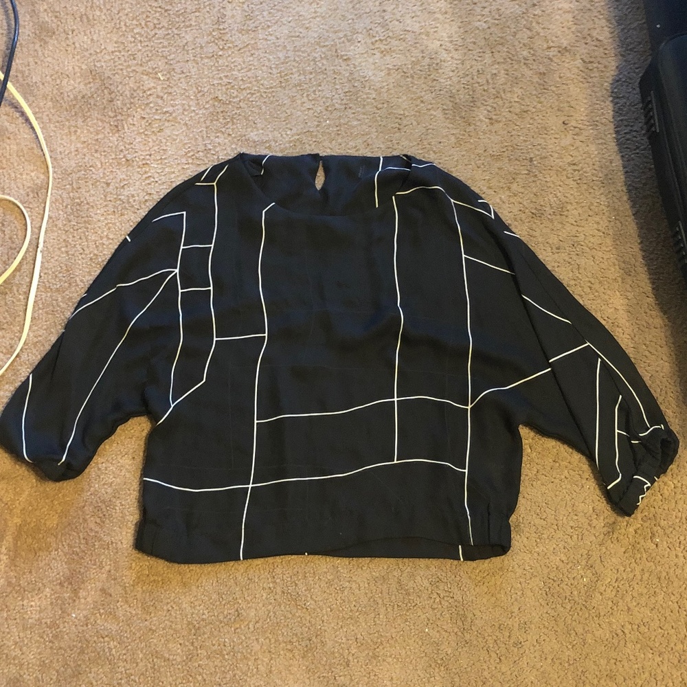 Mid sleeve, flowing blouse. Black and white geometric patterns. Business casual attire