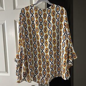 Stylish blouse with a bold geometric pattern. Features a mix of yellow, black, and white colors. Perfect for a chic look.