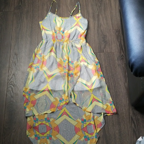 High-low dress with geometric pattern. Sheer fabric with an attached inner lining. EUC. Worn only a few times