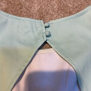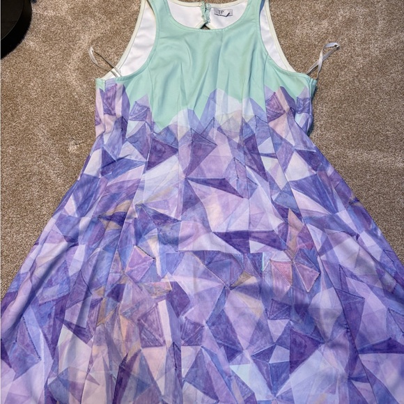 Stylish dress by Tobi. Features minty blue top with purple geometric skirt.