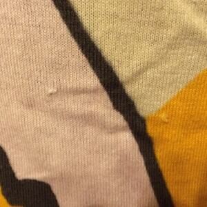 Soft and eye catching, some pilling, 3 spots with pulled threads barely noticeable unless really close; it's size S but fits snug more like a XS