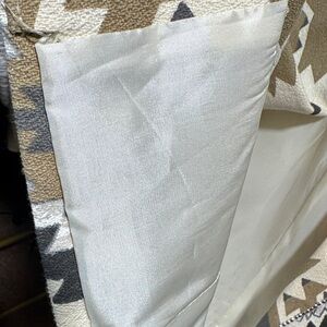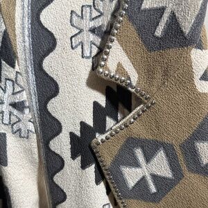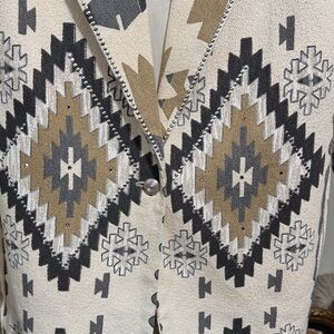 Stylish oversized blazer with geometric patterns. Features a mix of black, cream, and tan colors. Tapestry like fabric and weight. Beautiful silver bead accents. Fully lined. This is such a quality piece!! Perfect for a bold fashion statement.