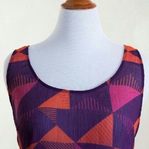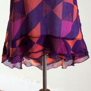 Bright and fun sleeveless hi-lo top. Semi-sheer fabric with ruffle on bottom.