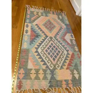 Enhance your home decor with this vibrant geometric patterned area rug. Featuring a blend of blue, pink, and cream colors, this rug adds a touch of elegance to any room.