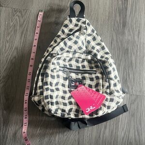 Stylish backpack with a geometric pattern. Features a front zipper pocket and adjustable strap.