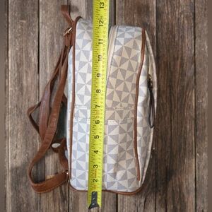 Stylish backpack with a geometric design. Features a blend of gray and brown vegan leather colors for a modern look. Perfect for everyday use.