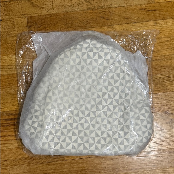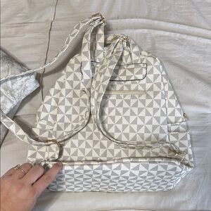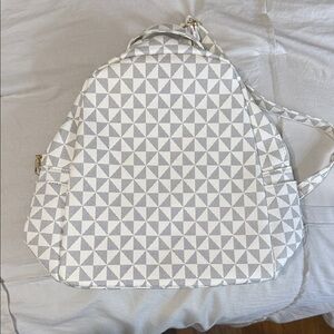 Stylish bag with a geometric pattern. Features a blend of gray and cream colors.