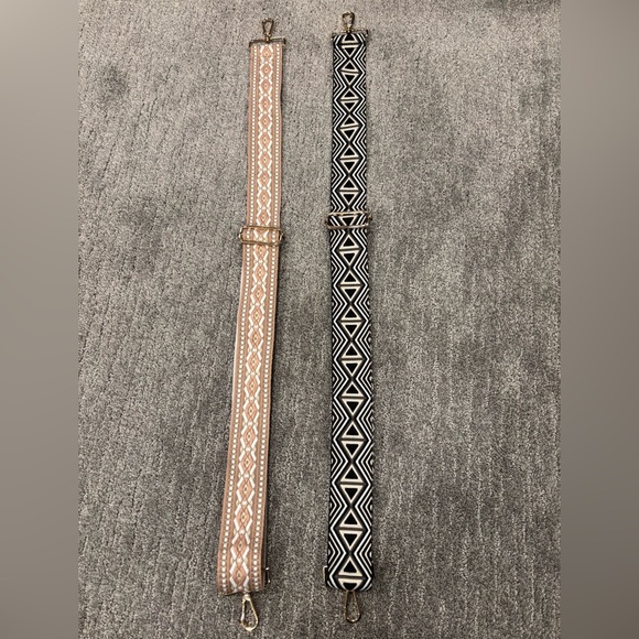 Set of two bag straps with geometric patterns. One strap is tan with white designs, and the other is black with white designs. Perfect for adding style to any bag.