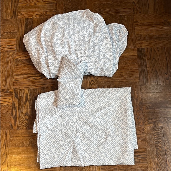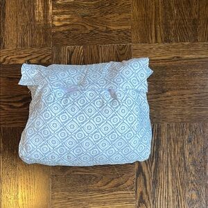 Enhance your bedroom with these stylish geometric patterned bedding sheets. Blue and white pattern. New, never used. 100% polyester. Comes in fabric bag. 3 piece set.