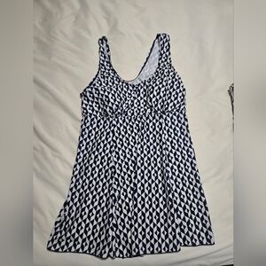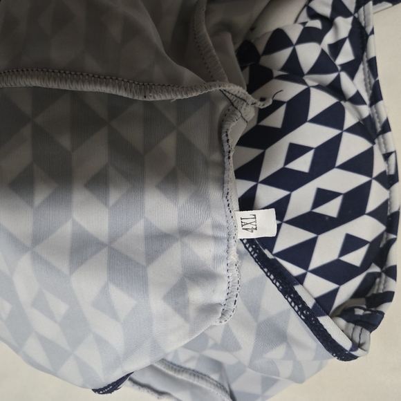 Stylish bikini top with a geometric pattern. Features shades of blue and white.