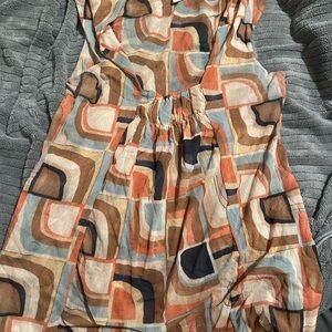 Stylish blouse with a geometric pattern. Features shades of orange, blue, and brown.