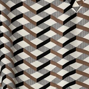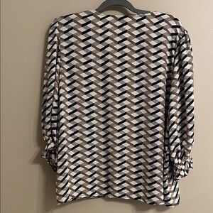 Elevate your style with this chic geometric patterned v-neck top. Featuring a blend of black, white, and brown hues, this top is perfect for any occasion. Its elegant design and comfortable fit make it a must-have in your wardrobe. Very flowy and comfy!