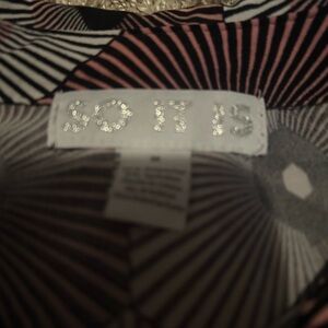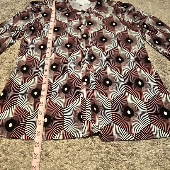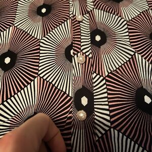 Stylish blouse with a geometric pattern. Features a mix of black, white, and brown colors.