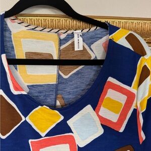 Stylish and vibrant, this blue dress features a bold geometric pattern. Perfect for any occasion, it combines comfort with a modern design.