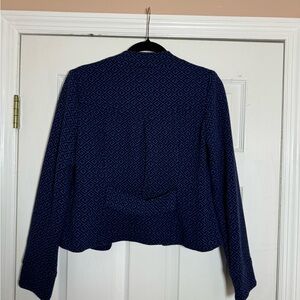 Stylish blue jacket with a unique geometric pattern. Perfect for adding a touch of elegance to any outfit.