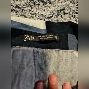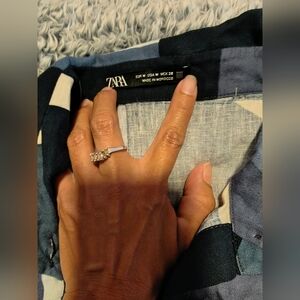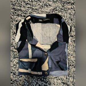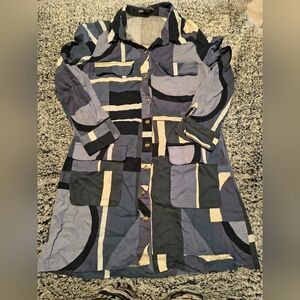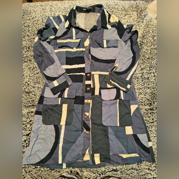 Stylish button-up dress with a geometric pattern. Features a mix of blue, black, and cream colors.