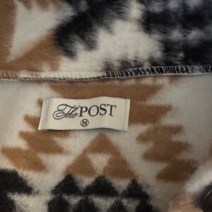 Cozy button-up jacket with a striking geometric design. Features shades of black, brown, and cream.