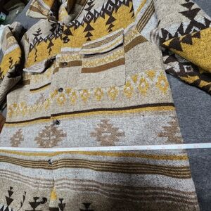 Stylish button-up shirt with a geometric pattern. Features shades of brown, tan, and gold.