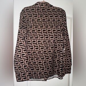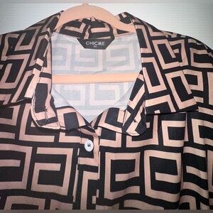 Stylish button-up shirt with a bold geometric pattern. Features a classic collar and button closure.