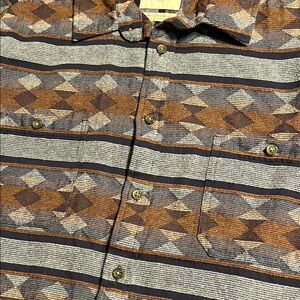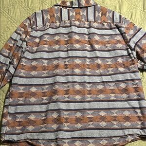 Stylish button-up shirt with a geometric pattern. Features a blend of orange, purple, and gray colors. Perfect for casual wear. Soft material. Size XL. Always accepting offers!