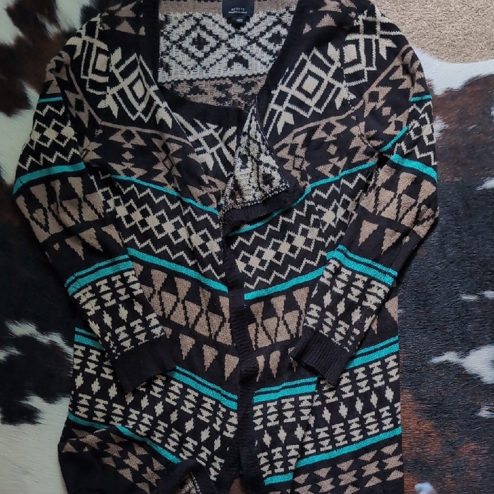 Stylish cardigan with geometric patterns in black, brown, and teal. great condition.