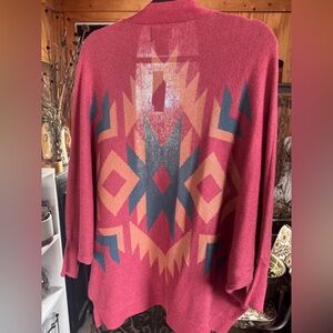 Stylish cardigan with a bold geometric pattern. Features rich red and tan colors.