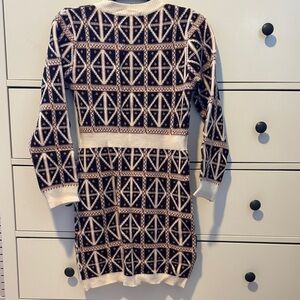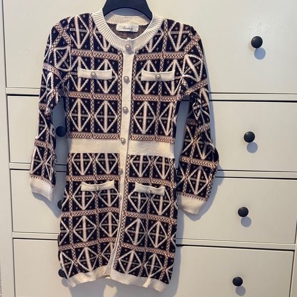 Stylish knit dress with geometric patterns. Features a button-up front and pocket details. Perfect for layering.