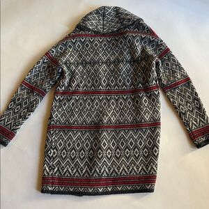 Stylish cardigan with geometric patterns and big shawl collar and a long length. Cozy and warm. Features black, white, and red colors. Like new condition. 💕